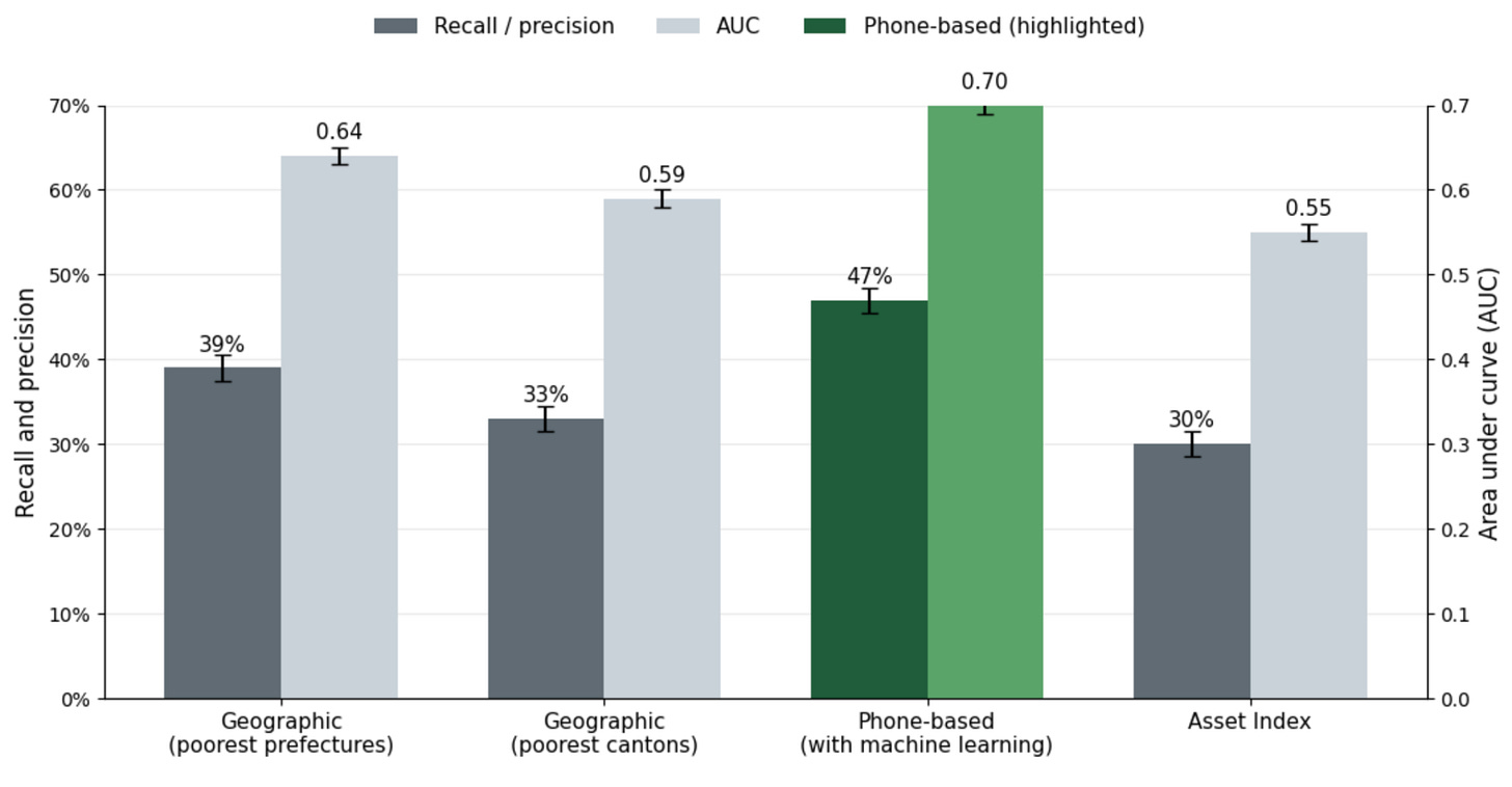 One obvious concern with algorithmic targeting is bias: do these models systematically exclude already-vulnerable groups? In the Togo study, researchers explicitly compared error rates across gender, age, religion, household type, and ethnicity, and found no evidence that the machine-learning approach was more likely than other targeting methods to wrongly exclude any demographic groups. I was initially skeptical that these models wouldn’t have demographic bias given differential phone ownership and use, so this was a notable and important aspect of the study for me.