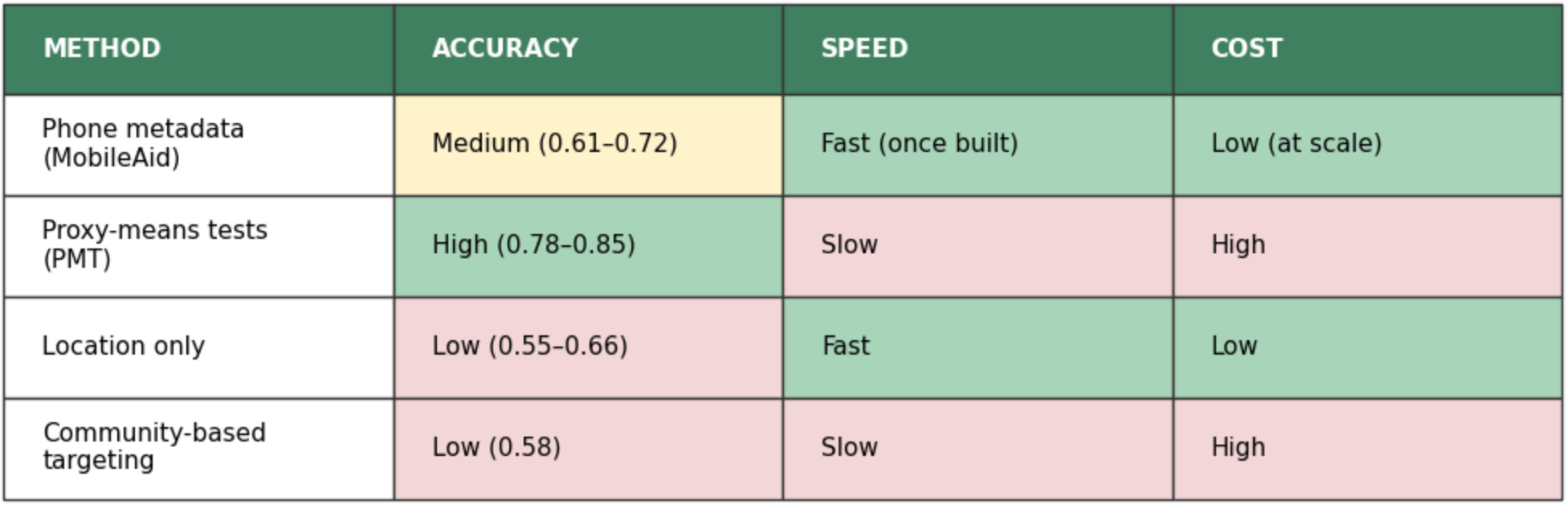 GiveDirectly has since launched studies testing MobileAid in Bangladesh, Malawi, Kenya, and the Democratic Republic of Congo. In Bangladesh, for example, phone metadata was consistently more accurate than community targeting, and though it was less accurate than full proxy-means tests, it was far faster and cheaper to deploy at scale. When researchers simulated large programs operating under tight budgets — screening many households with limited funds — phone-based targeting showed the greatest welfare impact per dollar spent, exactly because it could move quickly when surveys could not.