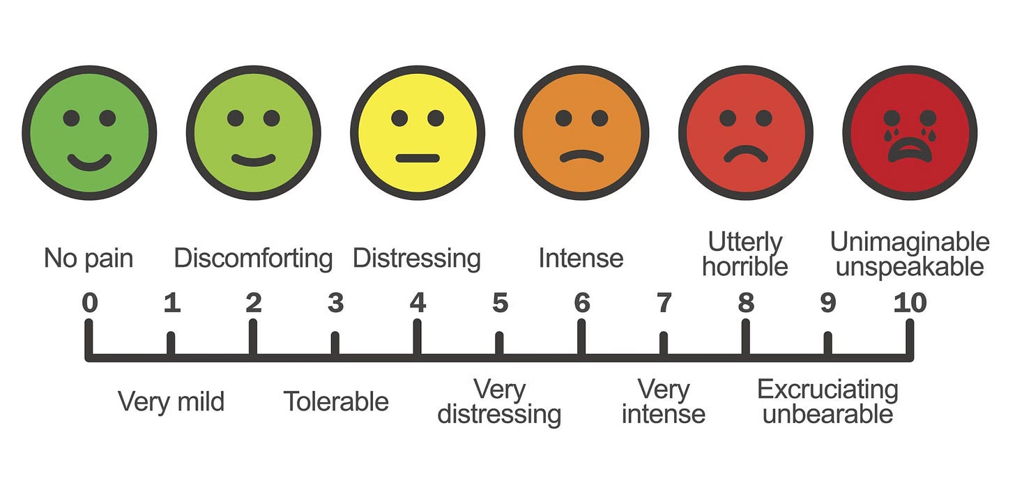 We usually measure pain on a self-reported 1-10 scale, where 1 is very mild and 10 is the worst pain imaginable.